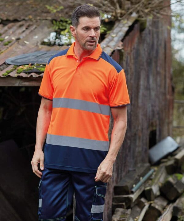 The Yoko Hi-Vis Two-Tone Polo Shirt (HVJ220) is a certified Class 2 hi-vis polo for outdoor workers who want compliance with a smarter, more corporate look — with free logo embroidery included from £10.49.